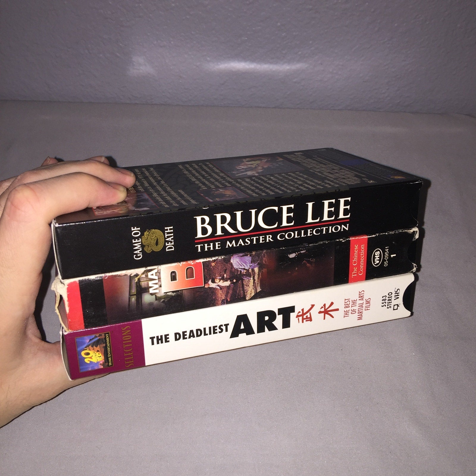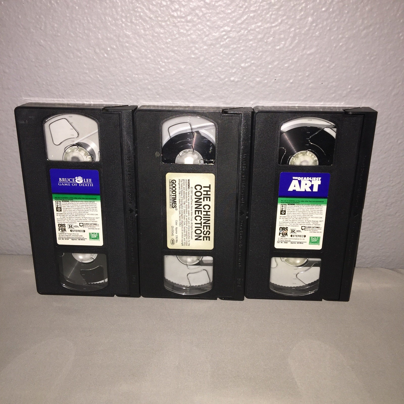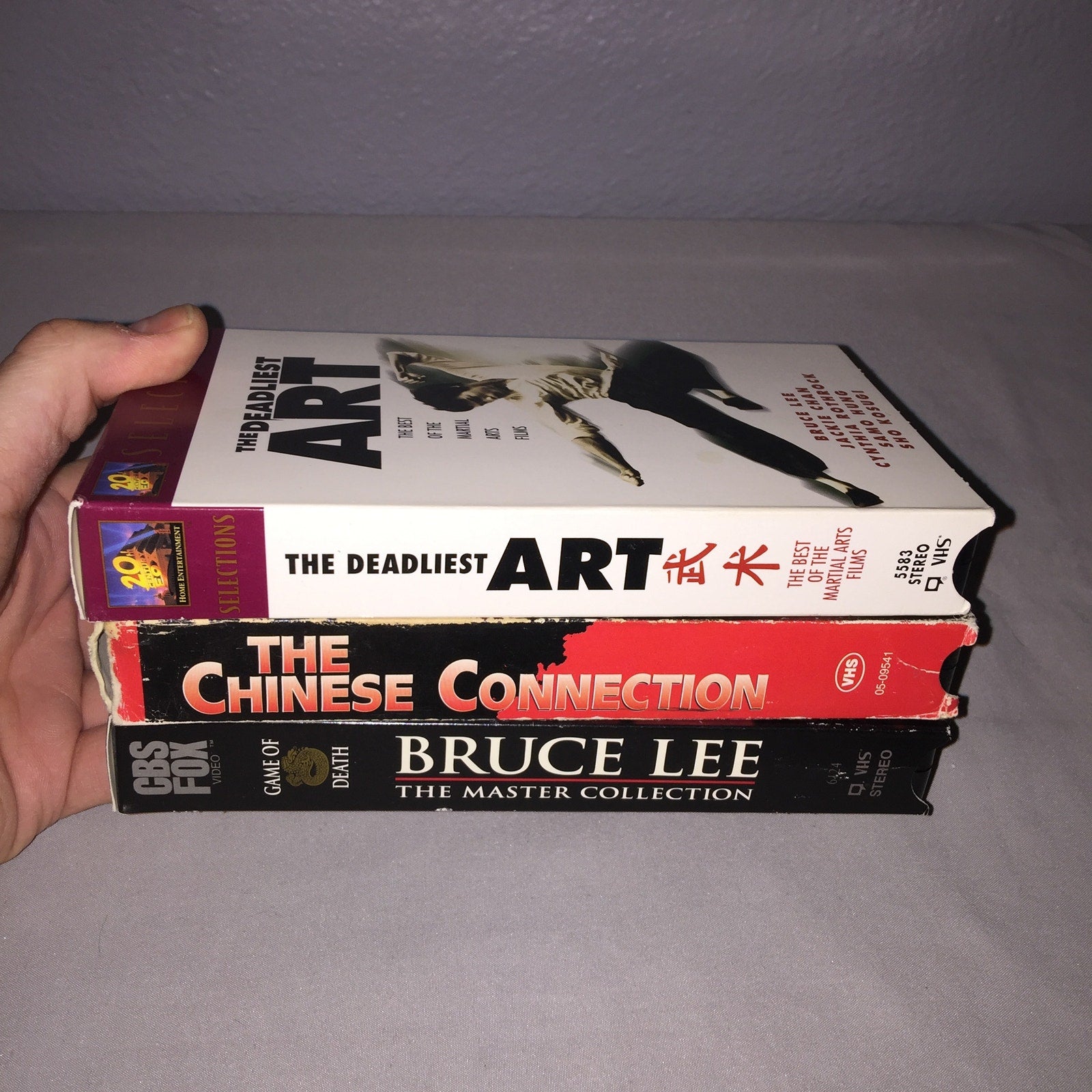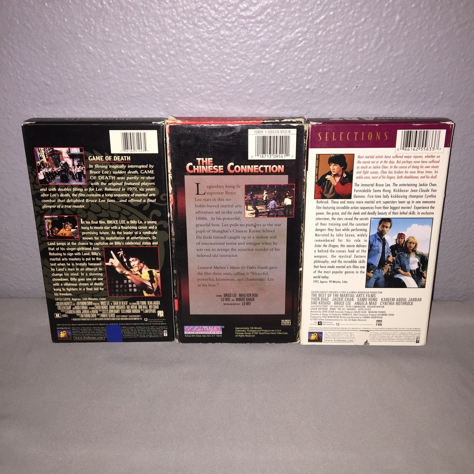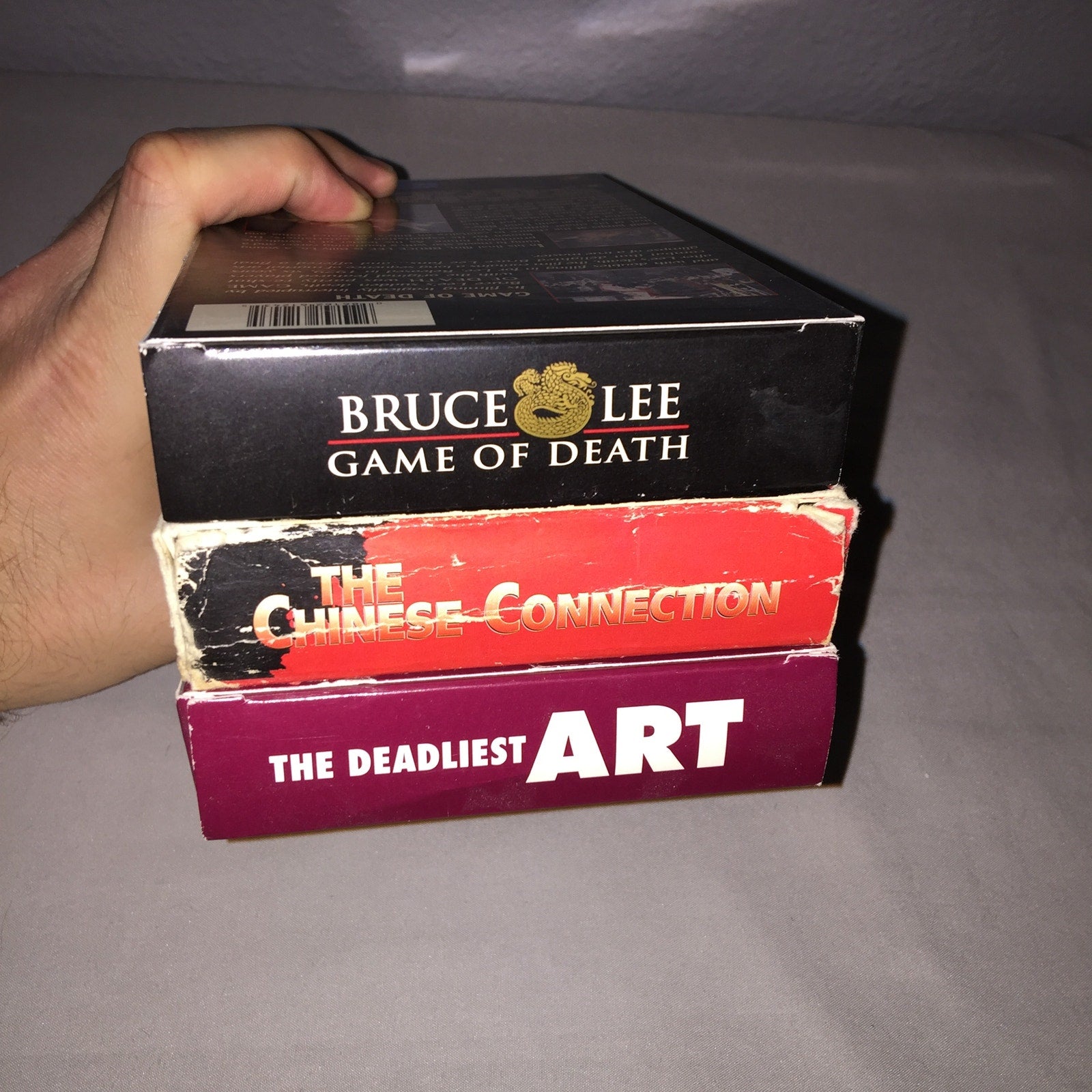 These items shipped secured in place with bubble wrap in a box. The Chinese Connection has a lot of bad corner and edgewear and even one inner corner piece ripped off but it's not too glaring see pics. Game Of Death and The Deadliest Art are in great condition just some minor issues except The Deadliest Art has a small bit ripped off where the factory sticker was and it's more of a variety tape including Bruce Lee , Jackie Chan and Samo Hung as well as a few other famous Martial Artists of the time. Weight: 19.5oz.